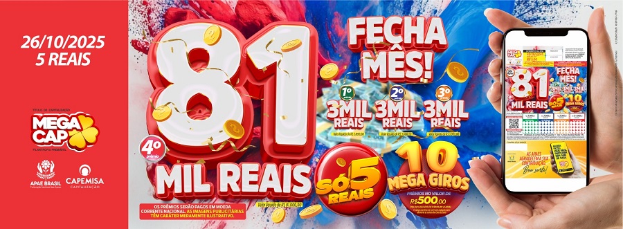 Título de Capitalização da Modalidade Filantropia Premiável de Contribuição Única, emitido pela CAPEMISA Capitalização S/A, CNPJ 14.056.028/0001-55, aprovado pelo Processo SUSEP indicado no título. CONTATO LOCAL: [94] 3322-0990. SAC 0800 940 1130. OUVIDORIA 0800 707 4936, de segunda a sexta-feira, das 8h às 17h. É proibida a venda de título de capitalização a menores de dezesseis anos. O valor não exigido dentro do prazo prescricional, estabelecido pela legislação em vigor, acarretará a perda desse direito. A aquisição deste título faculta ao adquirente a cessão de 100% do direito de resgate à APAE BRASIL - FEDERAÇÃO NACIONAL DAS APAES, certificada nos termos da legislação em vigor. Antes de contratar consulte previamente as Condições Gerais. As condições contratuais/regulamento deste produto protocolizadas pela sociedade junto à SUSEP poderão ser consultadas no endereço eletrônico www.susep.gov.br, de acordo com o número de processo constante da proposta. Prêmios líquidos de imposto de renda. Confira o resultado dos sorteios e as condições de participação em www.megacapoficial.com.br.