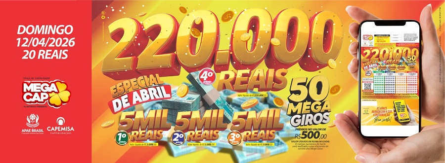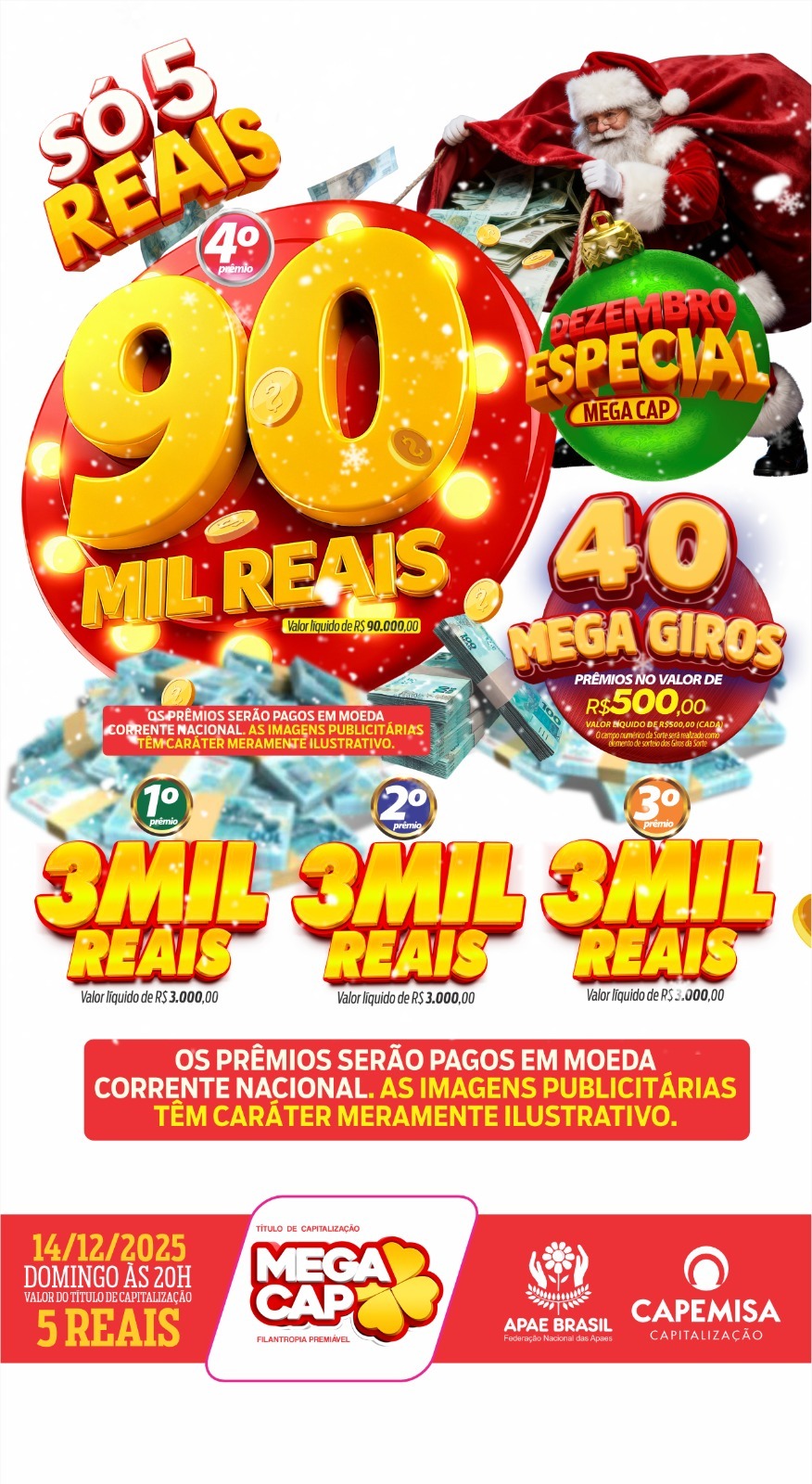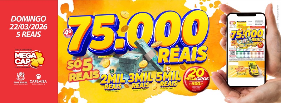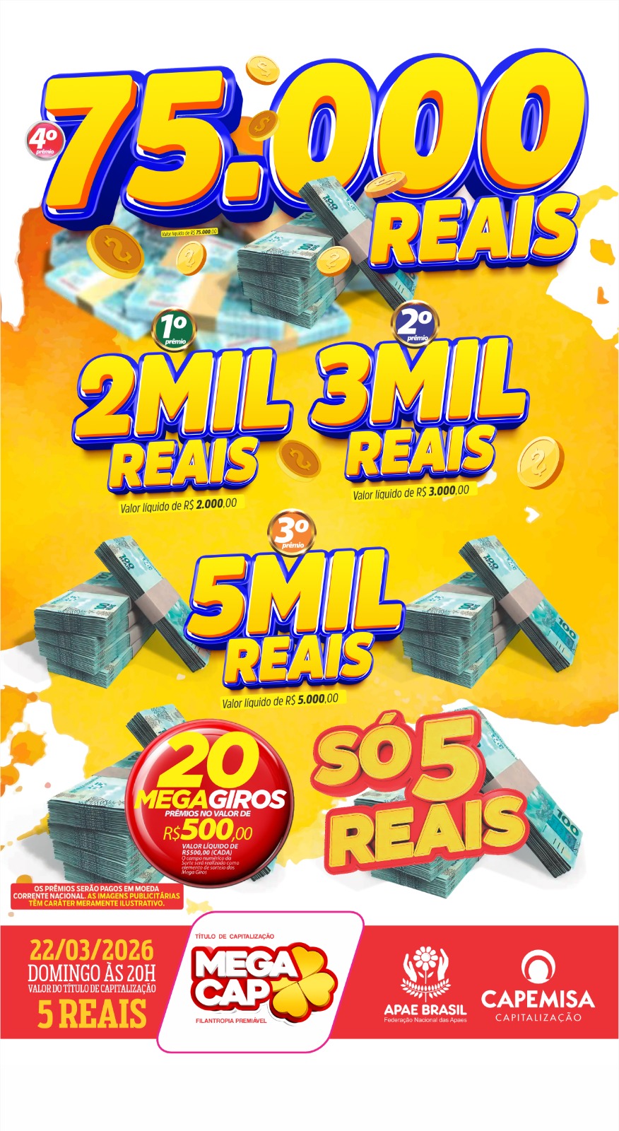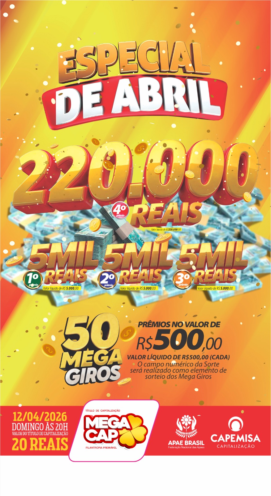 Título de Capitalização da Modalidade Filantropia Premiável de Contribuição Única, emitido pela CAPEMISA Capitalização S/A, CNPJ 14.056.028/0001-55, aprovado pelo Processo SUSEP indicado no título. CONTATO LOCAL: [94] 3322-0990. SAC 0800 940 1130. OUVIDORIA 0800 707 4936, de segunda a sexta-feira, das 8h às 17h. É proibida a venda de título de capitalização a menores de dezesseis anos. O valor não exigido dentro do prazo prescricional, estabelecido pela legislação em vigor, acarretará a perda desse direito. A aquisição deste título faculta ao adquirente a cessão de 100% do direito de resgate à APAE BRASIL - FEDERAÇÃO NACIONAL DAS APAES, certificada nos termos da legislação em vigor. Antes de contratar consulte previamente as Condições Gerais. As condições contratuais/regulamento deste produto protocolizadas pela sociedade junto à SUSEP poderão ser consultadas no endereço eletrônico www.susep.gov.br, de acordo com o número de processo constante da proposta. Prêmios líquidos de imposto de renda. Confira o resultado dos sorteios e as condições de participação em www.megacapoficial.com.br.