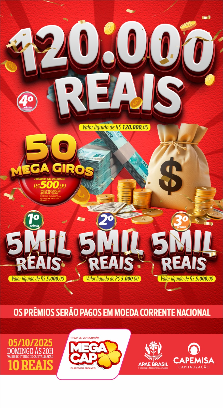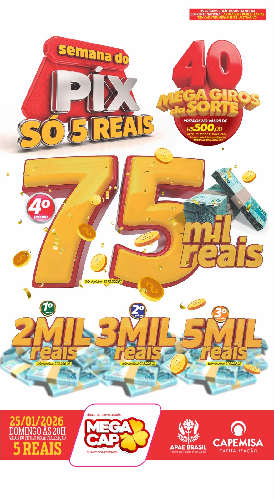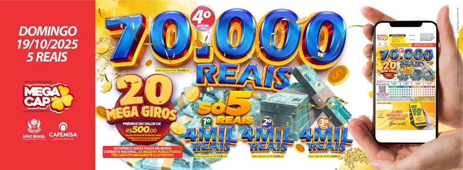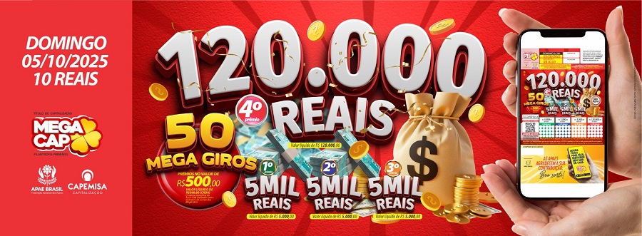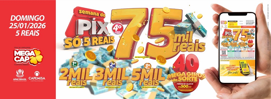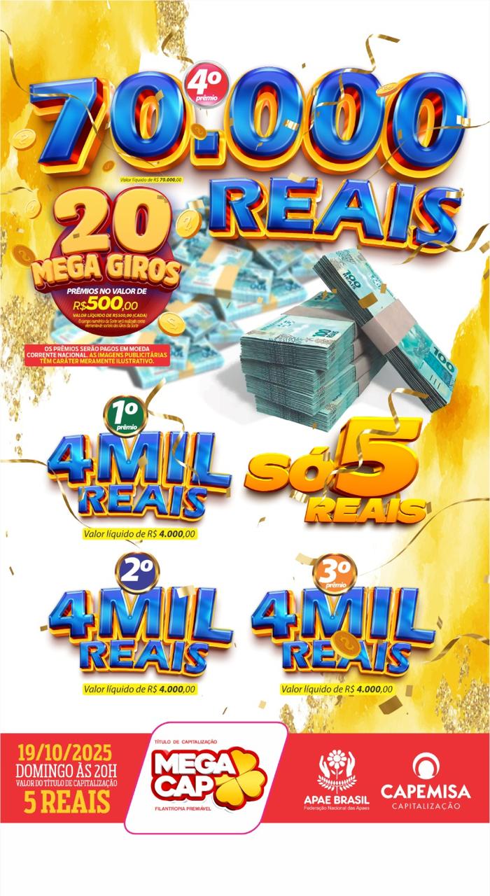 Título de Capitalização da Modalidade Filantropia Premiável de Contribuição Única, emitido pela CAPEMISA Capitalização S/A, CNPJ 14.056.028/0001-55, aprovado pelo Processo SUSEP indicado no título. CONTATO LOCAL: [94] 3322-0990. SAC 0800 940 1130. OUVIDORIA 0800 707 4936, de segunda a sexta-feira, das 8h às 17h. É proibida a venda de título de capitalização a menores de dezesseis anos. O valor não exigido dentro do prazo prescricional, estabelecido pela legislação em vigor, acarretará a perda desse direito. A aquisição deste título faculta ao adquirente a cessão de 100% do direito de resgate à APAE BRASIL - FEDERAÇÃO NACIONAL DAS APAES, certificada nos termos da legislação em vigor. Antes de contratar consulte previamente as Condições Gerais. As condições contratuais/regulamento deste produto protocolizadas pela sociedade junto à SUSEP poderão ser consultadas no endereço eletrônico www.susep.gov.br, de acordo com o número de processo constante da proposta. Prêmios líquidos de imposto de renda. Confira o resultado dos sorteios e as condições de participação em www.megacapoficial.com.br.