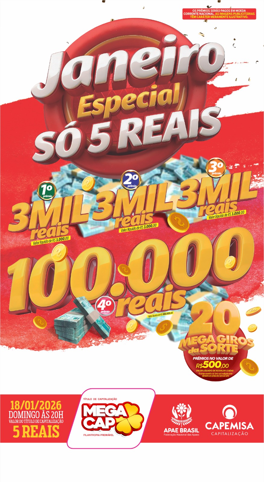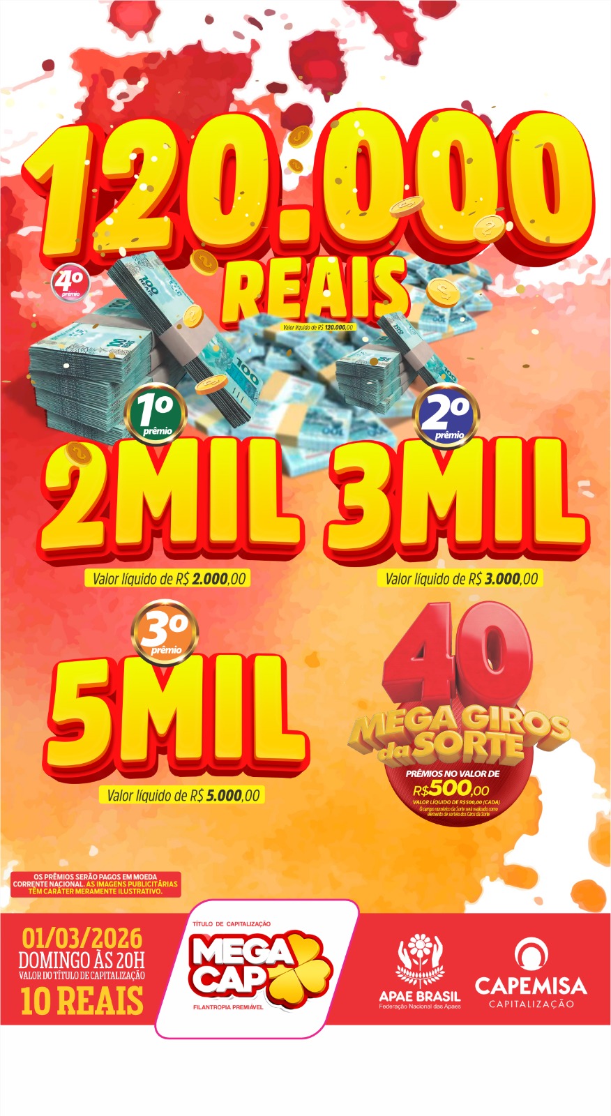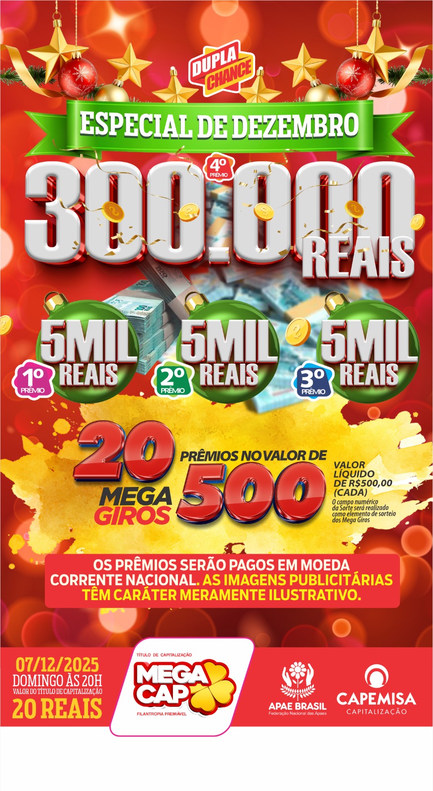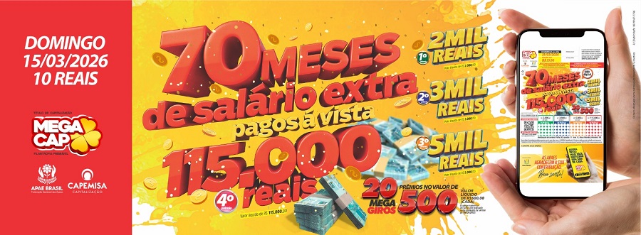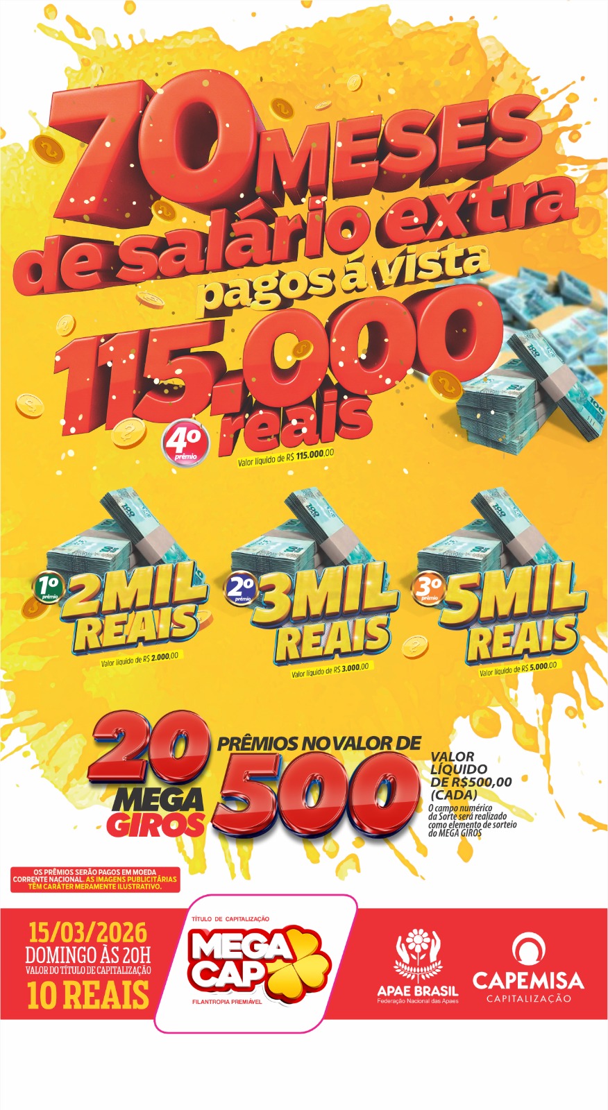 Título de Capitalização da Modalidade Filantropia Premiável de Contribuição Única, emitido pela CAPEMISA Capitalização S/A, CNPJ 14.056.028/0001-55, aprovado pelo Processo SUSEP indicado no título. CONTATO LOCAL: [94] 3322-0990. SAC 0800 940 1130. OUVIDORIA 0800 707 4936, de segunda a sexta-feira, das 8h às 17h. É proibida a venda de título de capitalização a menores de dezesseis anos. O valor não exigido dentro do prazo prescricional, estabelecido pela legislação em vigor, acarretará a perda desse direito. A aquisição deste título faculta ao adquirente a cessão de 100% do direito de resgate à APAE BRASIL - FEDERAÇÃO NACIONAL DAS APAES, certificada nos termos da legislação em vigor. Antes de contratar consulte previamente as Condições Gerais. As condições contratuais/regulamento deste produto protocolizadas pela sociedade junto à SUSEP poderão ser consultadas no endereço eletrônico www.susep.gov.br, de acordo com o número de processo constante da proposta. Prêmios líquidos de imposto de renda. Confira o resultado dos sorteios e as condições de participação em www.megacapoficial.com.br.