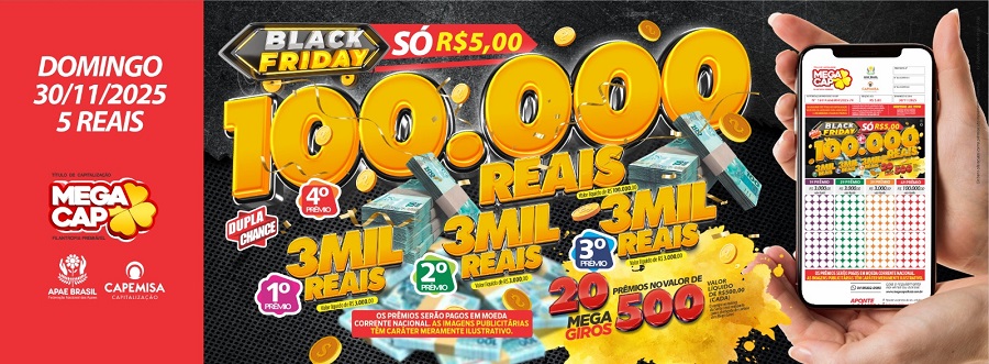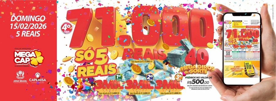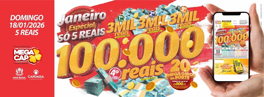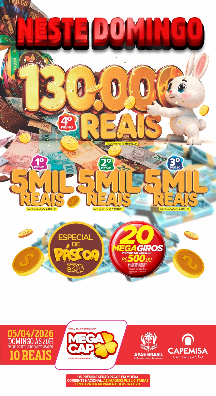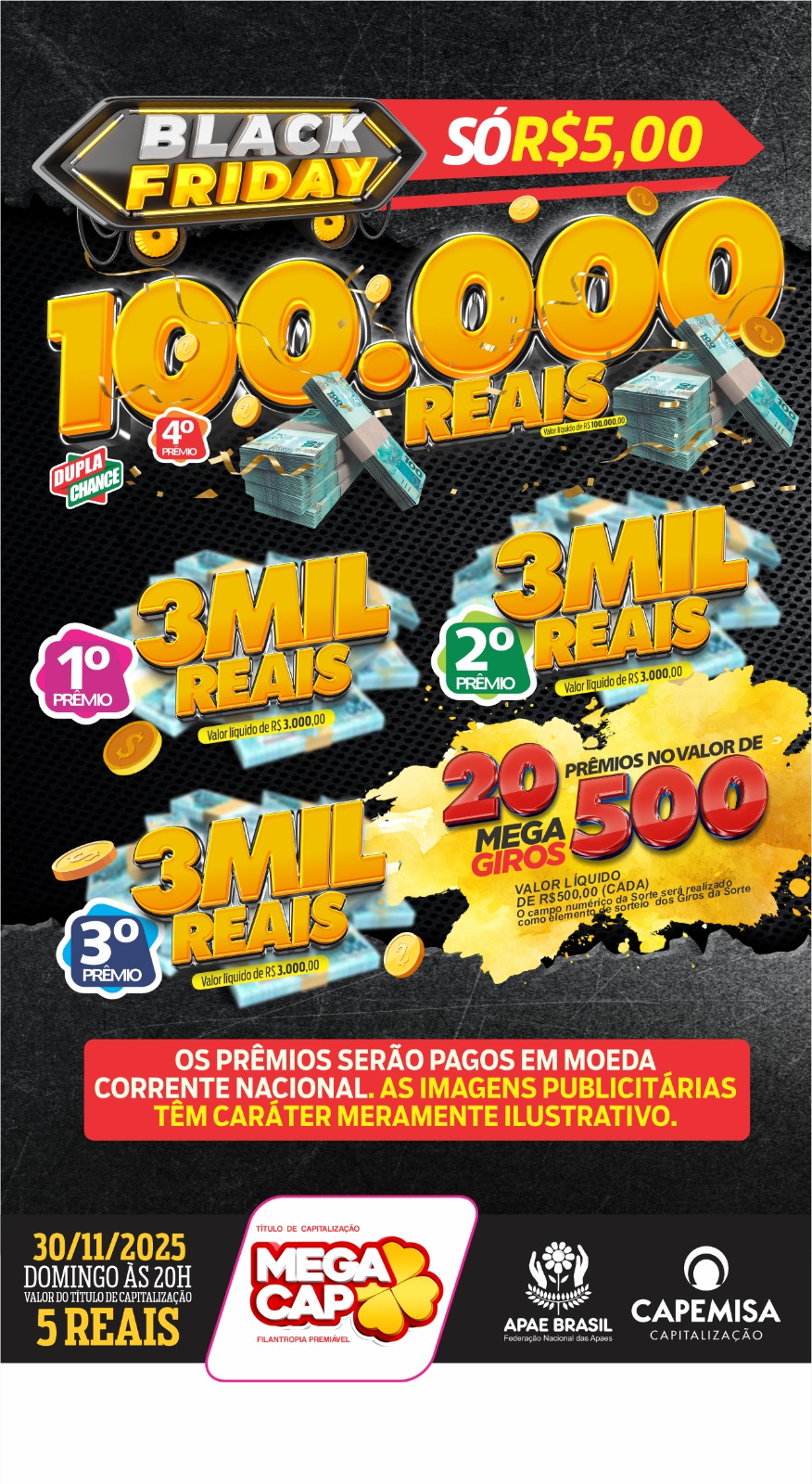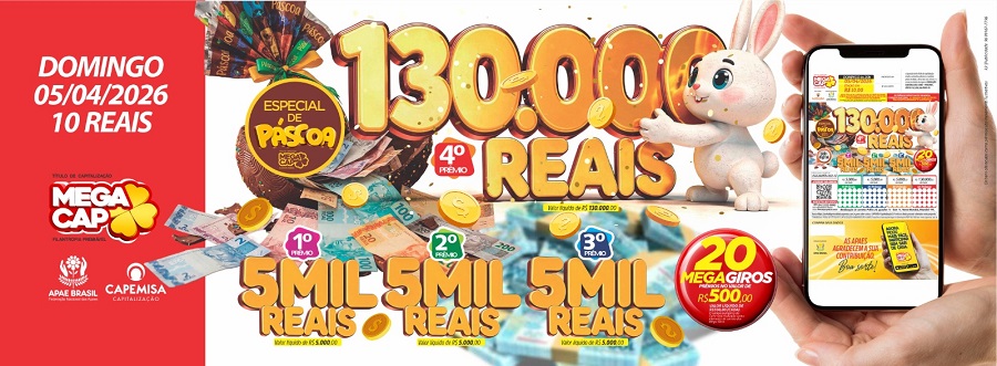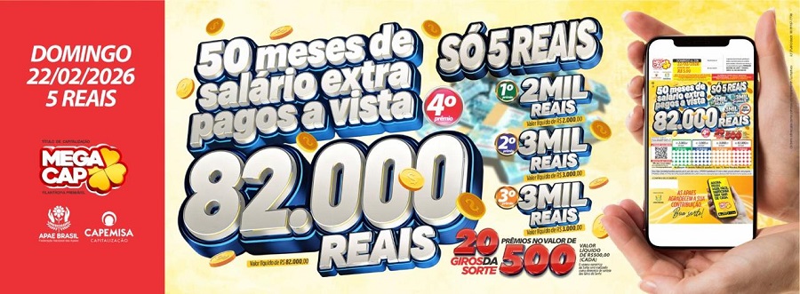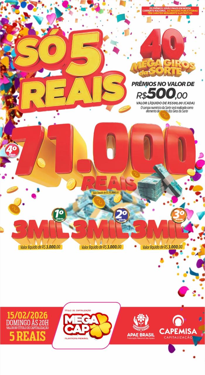 Título de Capitalização da Modalidade Filantropia Premiável de Contribuição Única, emitido pela CAPEMISA Capitalização S/A, CNPJ 14.056.028/0001-55, aprovado pelo Processo SUSEP indicado no título. CONTATO LOCAL: [94] 3322-0990. SAC 0800 940 1130. OUVIDORIA 0800 707 4936, de segunda a sexta-feira, das 8h às 17h. É proibida a venda de título de capitalização a menores de dezesseis anos. O valor não exigido dentro do prazo prescricional, estabelecido pela legislação em vigor, acarretará a perda desse direito. A aquisição deste título faculta ao adquirente a cessão de 100% do direito de resgate à APAE BRASIL - FEDERAÇÃO NACIONAL DAS APAES, certificada nos termos da legislação em vigor. Antes de contratar consulte previamente as Condições Gerais. As condições contratuais/regulamento deste produto protocolizadas pela sociedade junto à SUSEP poderão ser consultadas no endereço eletrônico www.susep.gov.br, de acordo com o número de processo constante da proposta. Prêmios líquidos de imposto de renda. Confira o resultado dos sorteios e as condições de participação em www.megacapoficial.com.br.